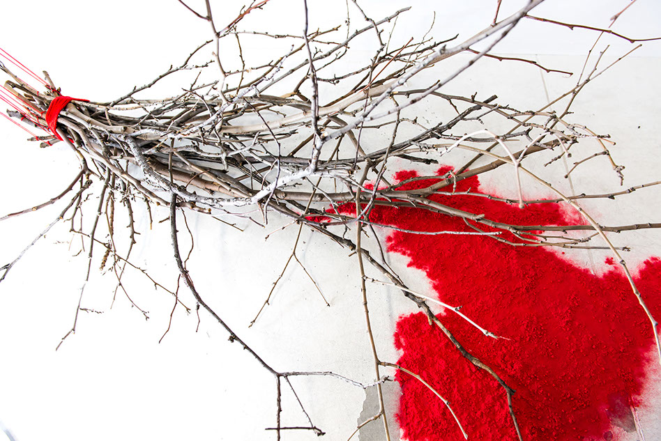 Apple Of Discord Project, 2014, Branches, red yarn, flocking powder, 250cm x 300cm - Detail