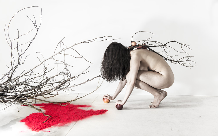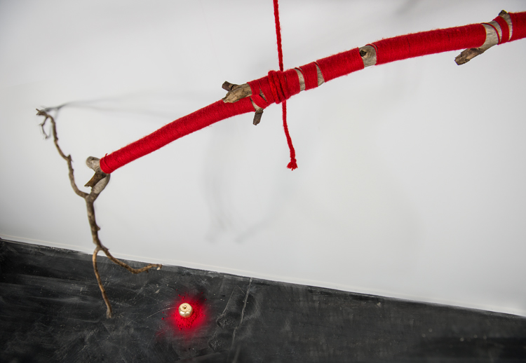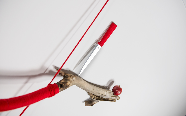 Apple Of Discord Project, 2014, Installation II, Branch, knife, gilded apple, red yarn, red apple, flocking powder, 250cm - Detail