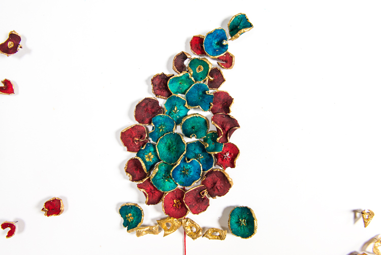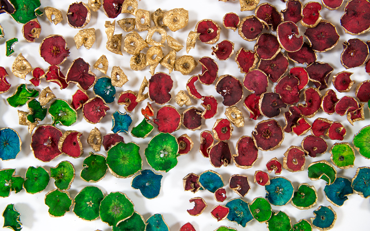 Apple Of Discord Project, 2014, Apples, gold leaf, processed apple slices, pins, red yarn, 250cm x 390cm - Detail