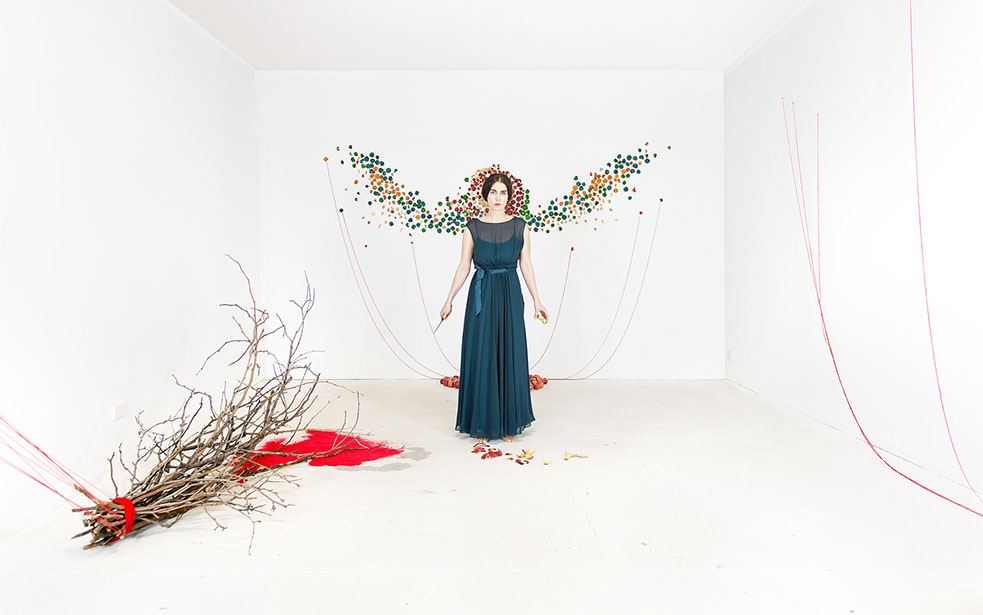 Apple Of Discord Project, 2014, Branches, red yarn, flocking powder, 250cm x 300cm