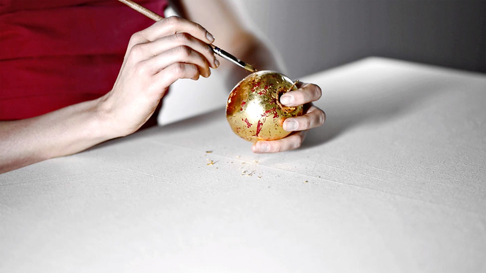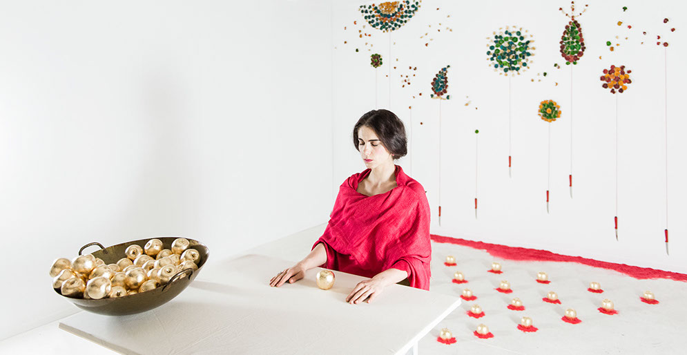 Apple Of Discord Project, 2014, Gilded apples, processed apple slices, knives, red yarn, flocking powder, 250cm x 450cm x 200cm - Detail