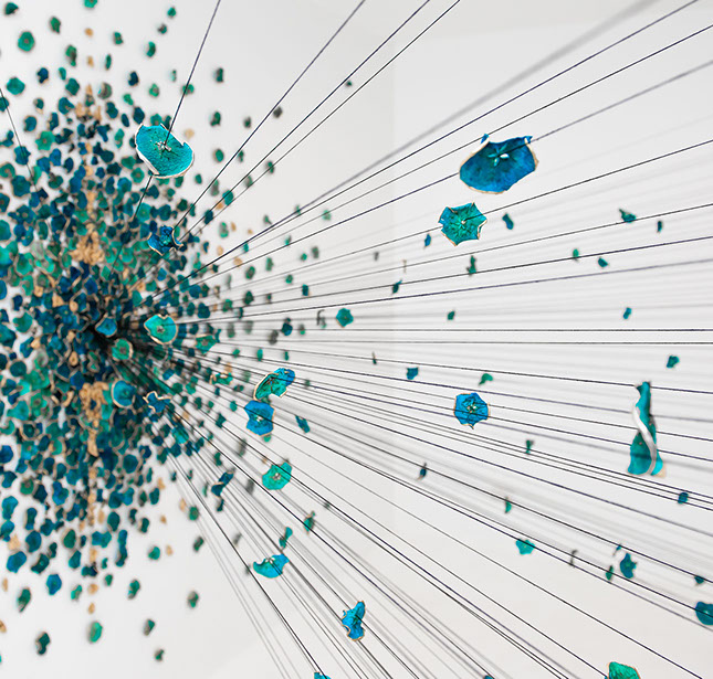BLUEMING II, 2018, Biennale Of Australian Art. Hand processed apple slices, gold leaf, stainless steel knife blades, cotton string, pins. Dimensions: 5m x 4.5m x 2.5m