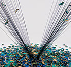 Hundreds of gilded, dried and hand-dyed apple slices are pinned to the wall and threaded onto a taut, cotton string. Surrounded by a mass of stainless steel knife blades, they burst into space forming a large bloom-like shape with black tendrils that pull the audience towards it.