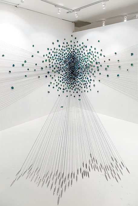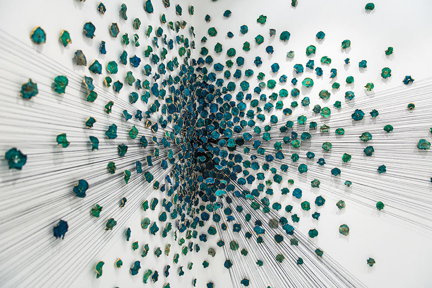 Hundreds of gilded, dried and hand-dyed apple slices are pinned to the wall and threaded onto a taut, cotton string. Surrounded by a mass of stainless steel knife blades, they burst into space forming a large bloom-like shape with black tendrils that pull the audience towards it.