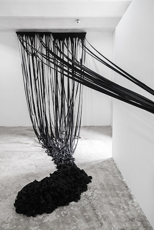 BOUND, 2017 - black fabric, wooden chair, black paint, paper, ink. Gallery dimensions: 16m x 6m x 4m
