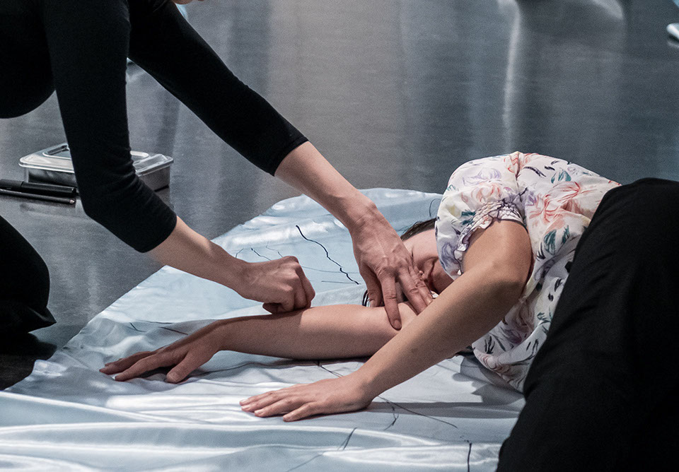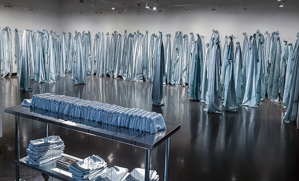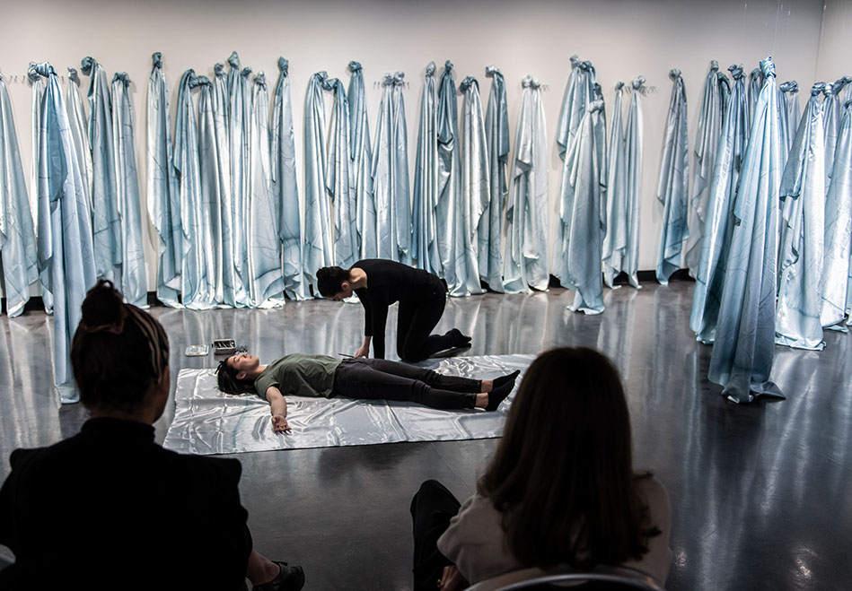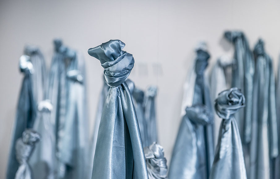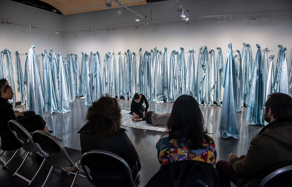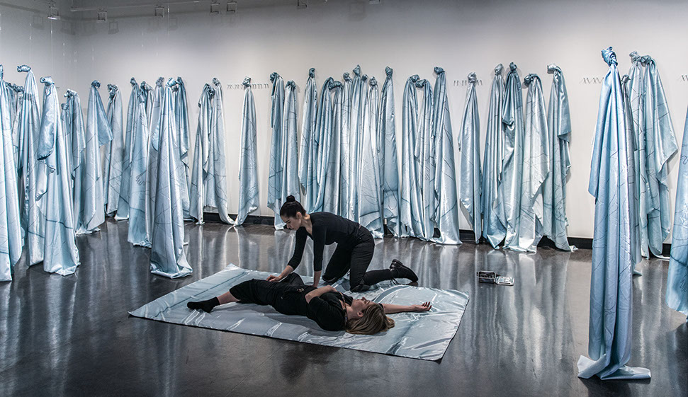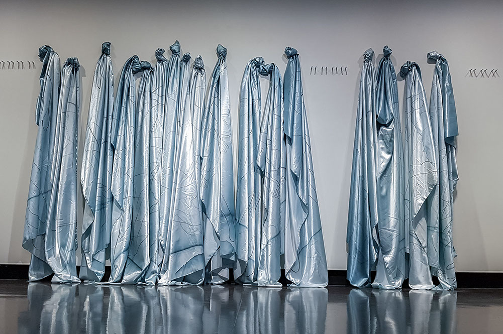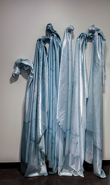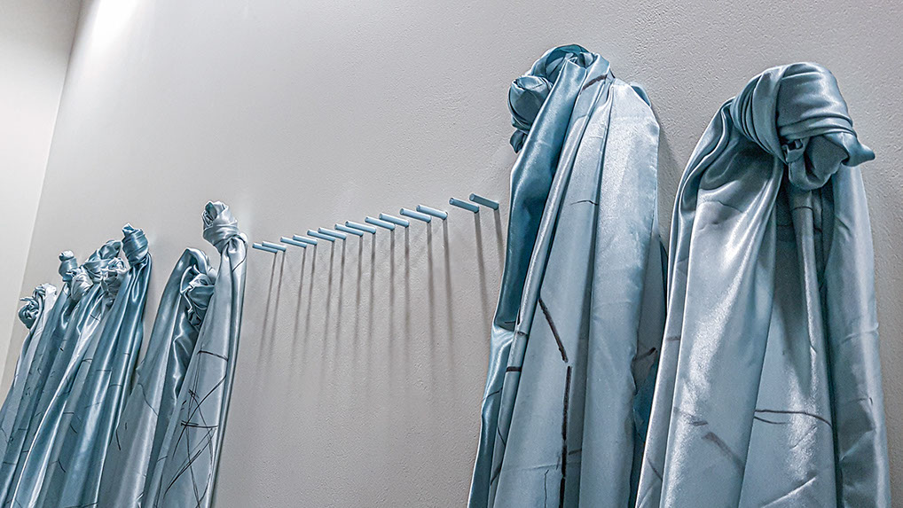THE GATHERING, 2019, hand dyed satin, charcoal, ink, pins, timber, nylon string. Dimensions variable.