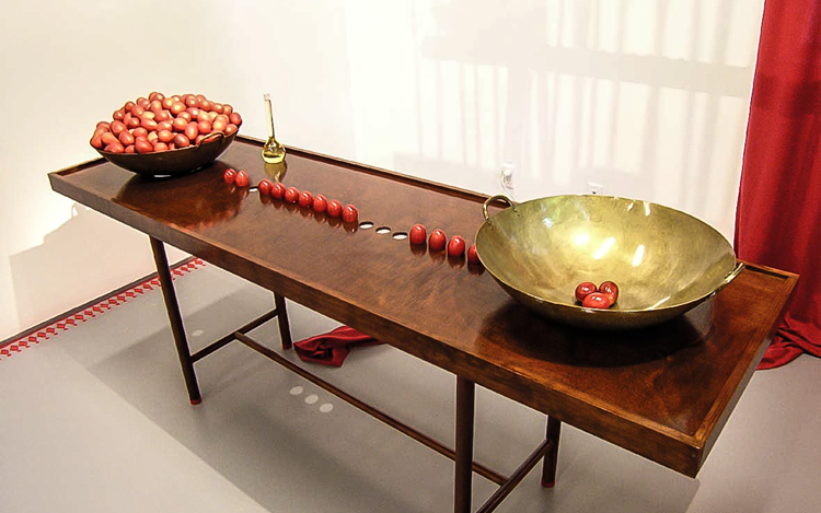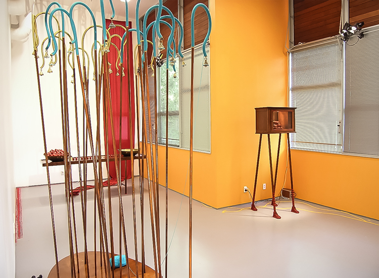 "The element of wit also appears in this show, as when a dribble of white thread complete with drops gives point to Fata’s Milk. All these assemblages are appealing but movement makes Nomadic Wonders outstanding. A group of tall, red shepherds, crooks bound at the top, are adorned with bells. A hidden mechanism shakes them to produce a lilting sound across the meadows of the mind.”
