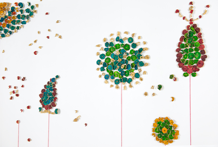Apple Of Discord Project, 2014, Apples, gold leaf, processed apple slices, pins, red yarn, 250cm x 390cm - Detail