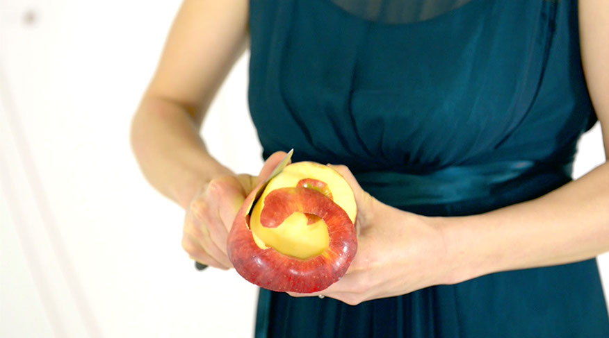 Apple Of Discord Project, 2014, Gilded apples, processed apple slices, knives, red yarn, flocking powder, 250cm x 450cm x 200cm - Detail