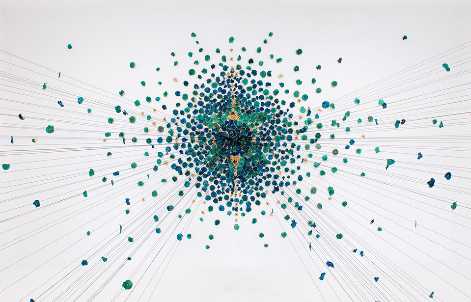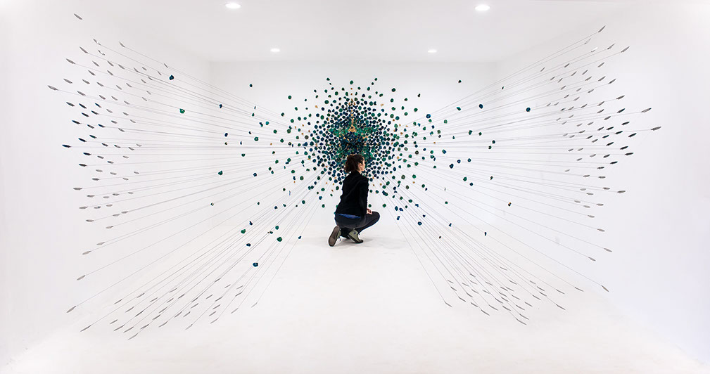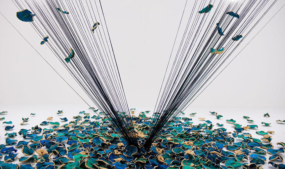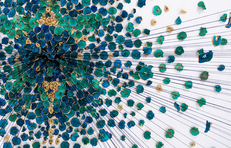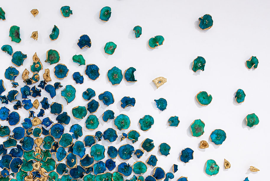 BLUEMING II, 2018, Biennale Of Australian Art. Hand processed apple slices, gold leaf, stainless steel knife blades, cotton string, pins. Dimensions: 5m x 4.5m x 2.5m