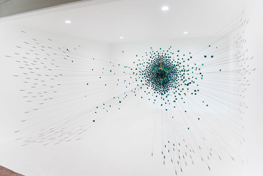 Hundreds of gilded, dried and hand-dyed apple slices are pinned to the wall and threaded onto a taut, cotton string. Surrounded by a mass of stainless steel knife blades, they burst into space forming a large bloom-like shape with black tendrils that pull the audience towards it.