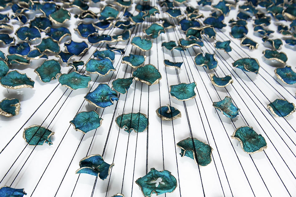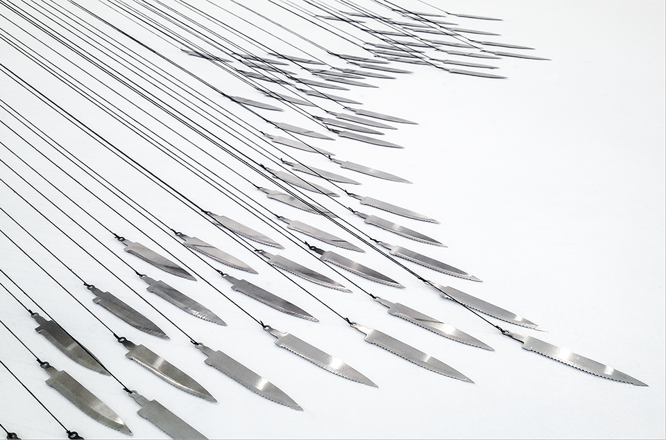 Hundreds of gilded, dried and hand-dyed apple slices are pinned to the wall and threaded onto a taut, cotton string. Surrounded by a mass of stainless steel knife blades, they burst into space forming a large bloom-like shape with black tendrils that pull the audience towards it.