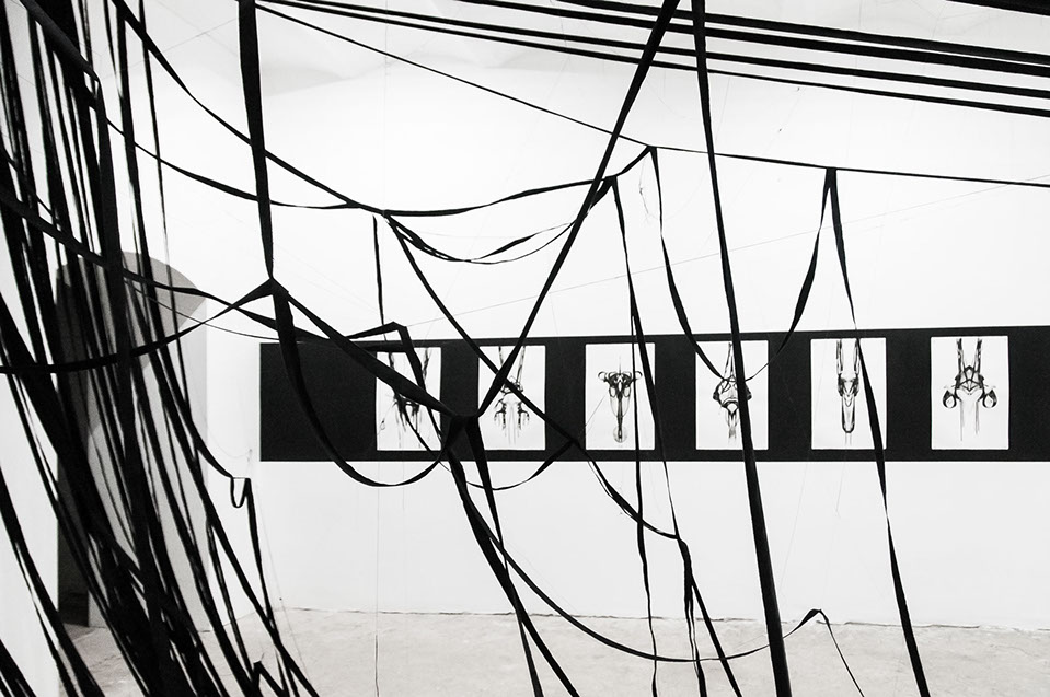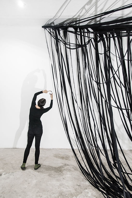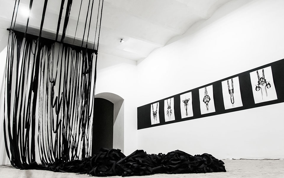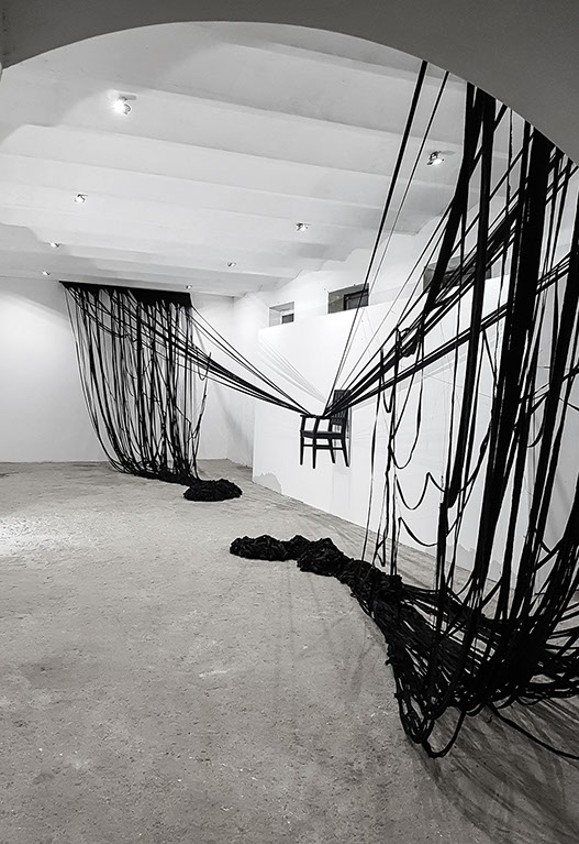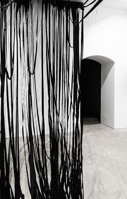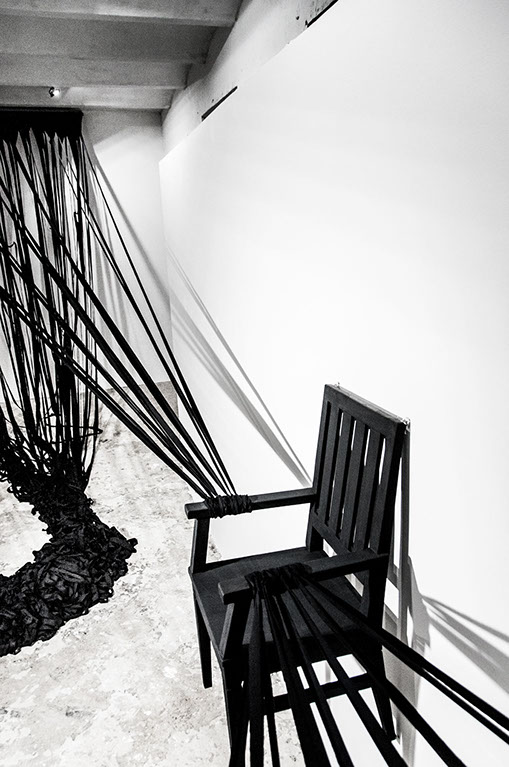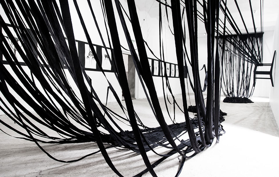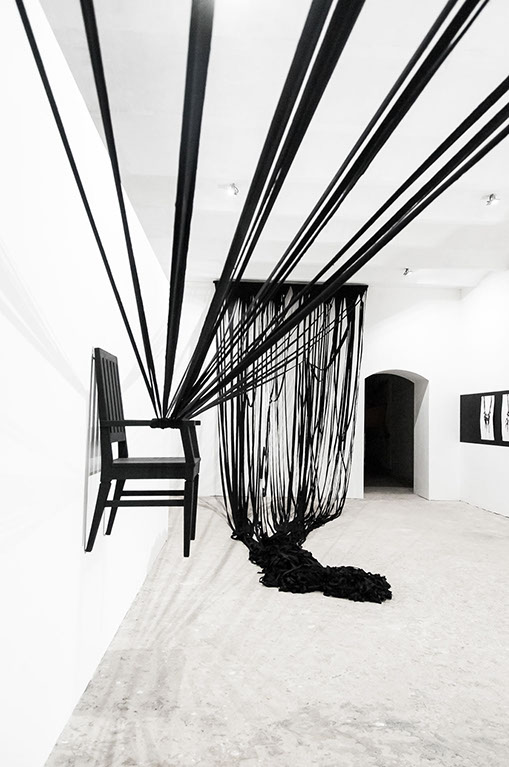 BOUND, 2017 - black fabric, wooden chair, black paint, paper, ink. Gallery dimensions: 16m x 6m x 4m