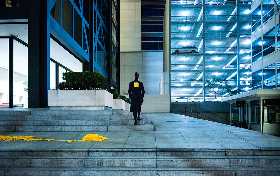 The yellow fabric entangling the performer's body alludes to obstacles and past hindrances that the artist is trying to break away from. The silent, ritualistic action of pulling, de-tangling, taking off the headdress - the past, and putting on the coat - the future, communicates struggle, change and hope. The work questions whether it is necessary to completely sever the links to negative past experiences in order to make space for forward movement and change.