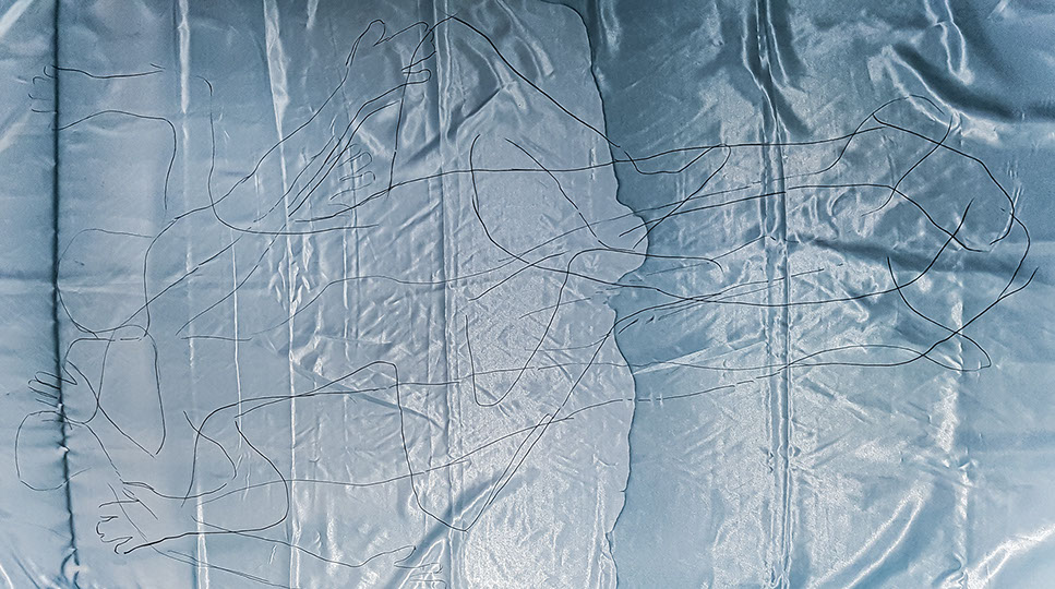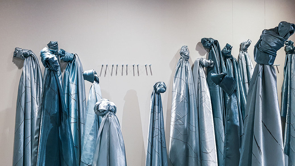 THE GATHERING, 2019, hand dyed satin, charcoal, ink, pins, timber, nylon string. Dimensions variable.